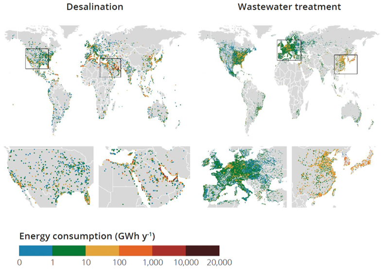 Spatial patterns in energy consumption use for desalination (left) and wastewater treatment (right) worldwide in 2015. Based on Magni et al. (2025)